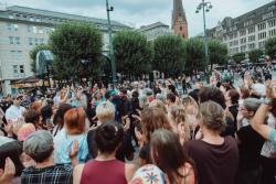 Mit einem spektakulären Performance-Programm begeisterte der französische Choreograf Saïdo Lehlouh am Samstag das Publikum der Kunstmeile Hamburg. Bei freiem Eintritt hatten die Häuser der Kunstmeile gemeinsam mit dem Internationalen Sommerfestival Kampnagel zu einem ganztägigen Performance-Programm in die Institutionen eingeladen, das seinen fulminanten Abschluss auf dem Rathausmarkt fand. Von Flamenco-Tänzer Israel Galván im Kunstverein, über die Tänzerin Ndoho Ange - die zusammen mit der Sängerin und Harfenistin Sophye Soliveau in der Kunsthalle auftrat - bis hin zur gemeinsamen Arbeit von Saïdo Lehlouh und Johanna Faye inmitten der aktuellen Ausstellung der Deichtorhallen: Das vielfältige Programm, bestehend aus weiteren herausragenden Performances im Museum für Kunst und Gewerbe, im Bucerius Kunst Forum und im Kunsthaus Hamburg, zog über 2.000 Zuschauer*innen an. Durch die über den Tag und die Institutionen verteilten einzelnen Stationen wurde im Dialog mit der Bildenden Kunst eine Verbindungslinie zwischen den sechs Häusern gezogen, die das vielfältige Kulturangebot in der Innenstadt deutlich machte. Oft gruppenweise machten sich die Zuschauer*innen auf den Weg zwischen den Institutionen, um inspiriert von dem gerade Gesehenen die nächste Performance zu besuchen. Am Abend endete der Tag in einer großen Abschlussperformance vor dem Rathaus, an der neben den Performer*innen auch über 100 weitere Tänzer*innen teilnahmen, die über einen Open Call eingeladen worden waren.